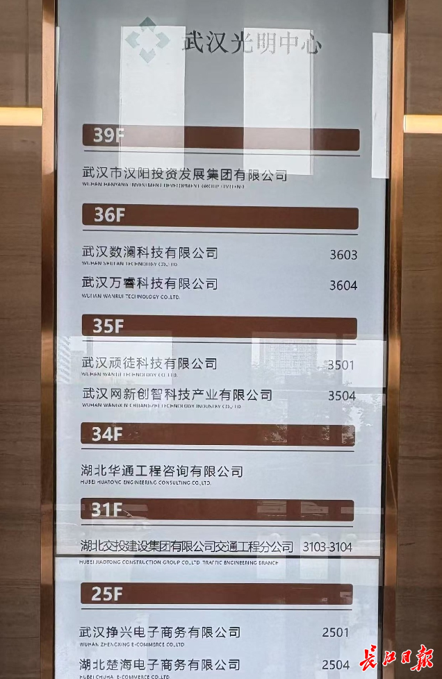 记者在写字楼内的楼层索引里看到,除了万睿科技,还有中建三局、中铁十一局、汉阳科创院、汉阳投发集团、康明斯、数澜科技等央国企、世界500强、数字经济与科技创新产业头部企业入驻。