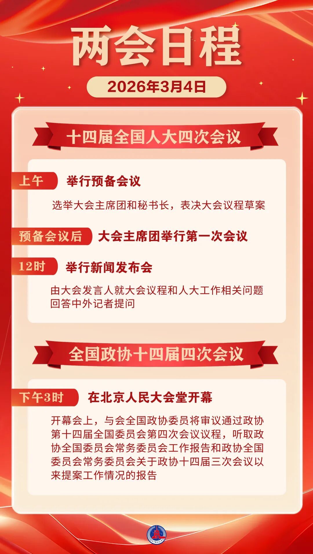 两会日程预告|3月4日:全国政协十四届四次会议下午3时开幕 十四届全国人大四次会议举行预备会议