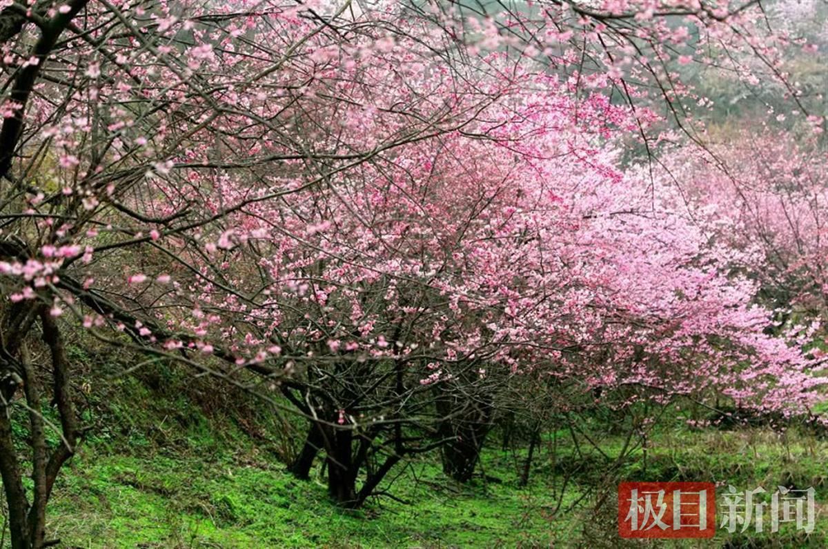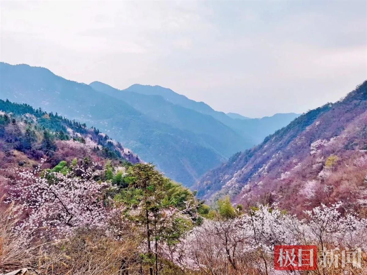 通城黄袍山野樱花属于晚樱品种,以粉红居多,花瓣则多为重瓣,其花蕾还具有“镇咳祛风”的药用价值。喜欢徒步的人最能体会黄袍山初春的美,沿着古道漫步,欣赏途中遍山樱花,观玩千亩油茶,都能带来不同的新鲜感。赏完樱花,还可以到附近的大涡村观硒泉、品泉水,亲历感受鄂南深处独特的山水之美。