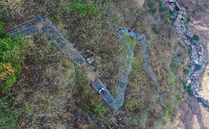 在四川省凉山彝族自治州昭觉县阿土列尔村的悬崖钢梯上,村民沿着钢梯下山(2020年5月13日摄)。新华社记者 王曦 摄