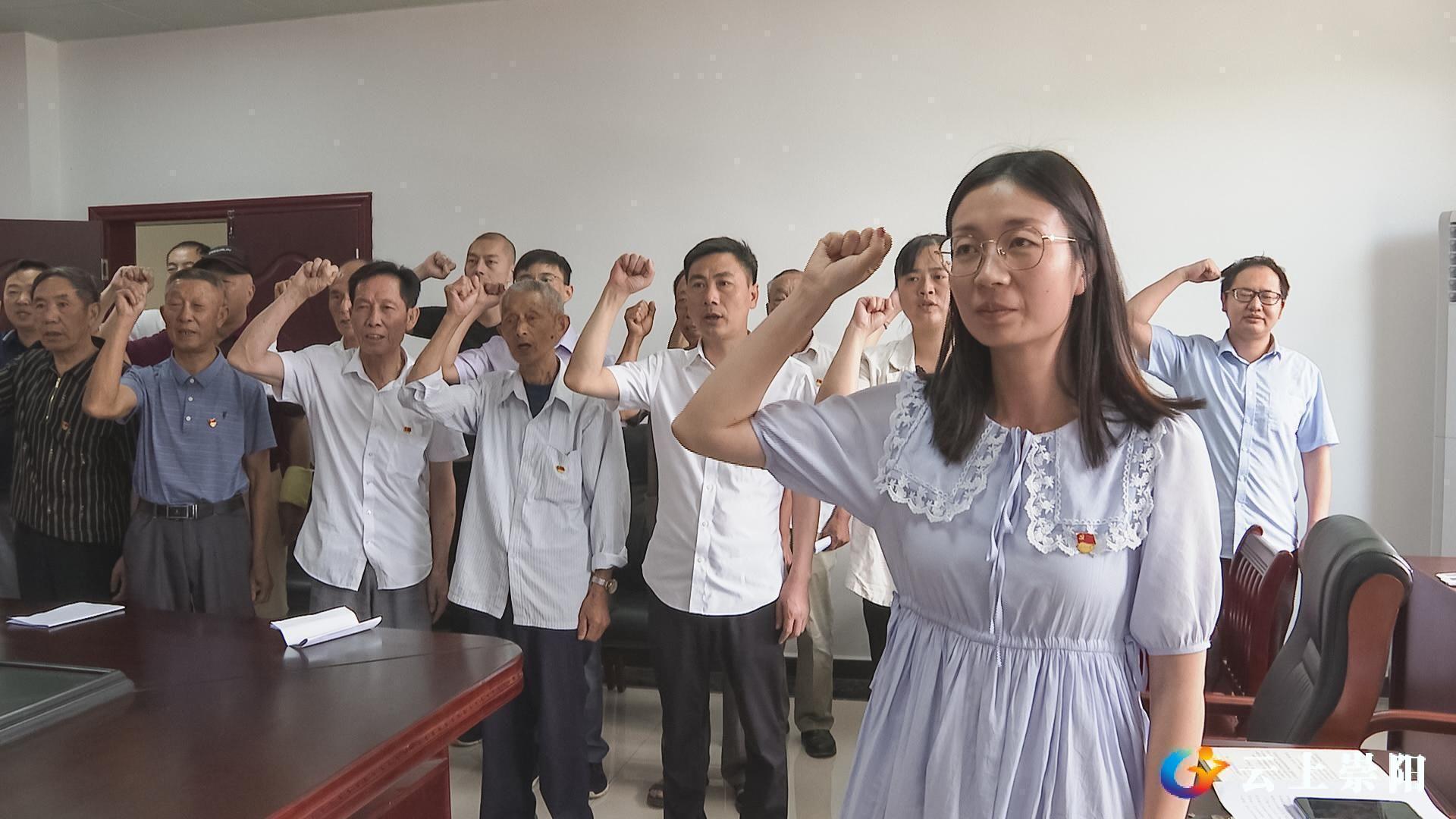 在鲜红的党旗下,汪新虎领誓,老重温入党誓词,新发展党员入党宣誓。