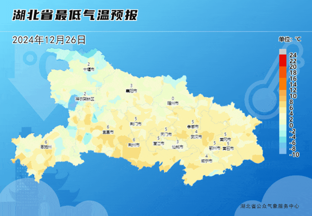预计12月27日受弱冷空气影响,湖北有4至6级偏北阵风。28日至29日早晨,湖北大部地区最低气温将降至-6℃至0℃。25日白天天空云层增厚,没有阳光的增温作用,各地气温萎靡不振,全省大部地区最高气温停留在4℃至9℃,相较24日同时次下滑了1℃至4℃。