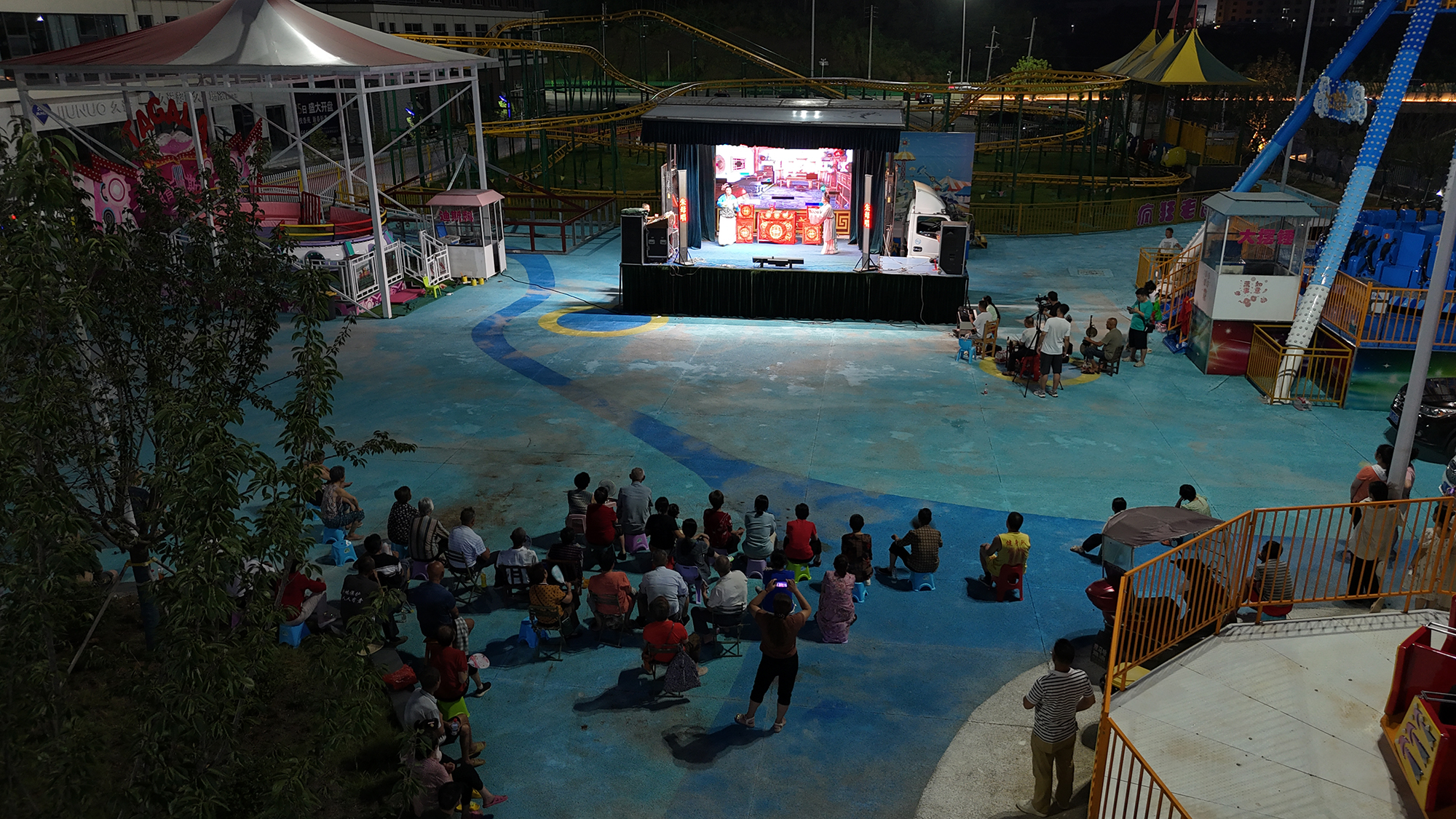 这是8月10日崇阳县提琴戏传承发展中心在城西一处游乐广场内开展提琴戏演出时的场景。尽管天气炎热,但是台下依然坐满了不少戏迷,台上唱得宛转悠扬,台下听得如痴如醉。