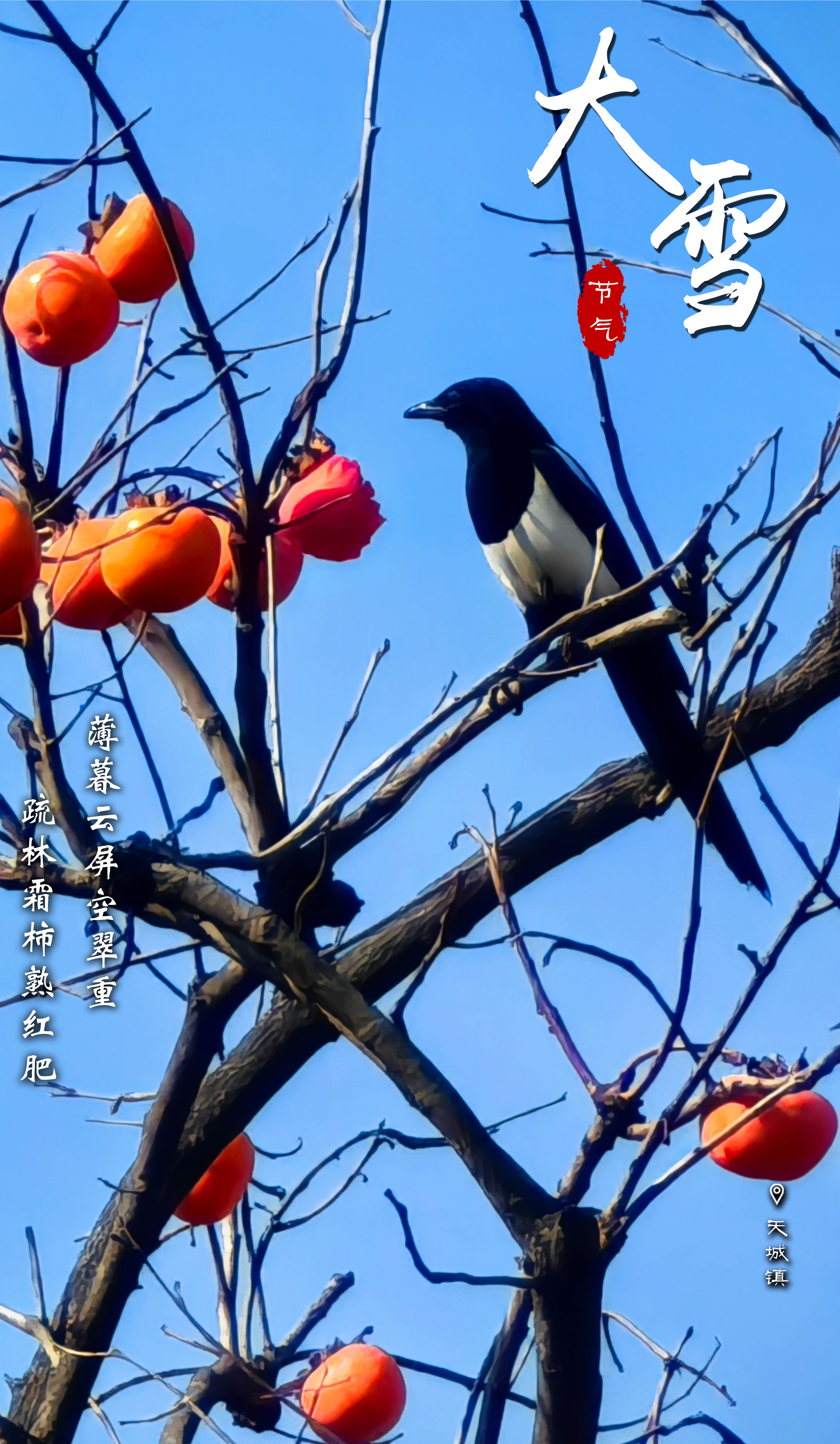 海报丨寒凝万物 暖景生香 2025-12-07 07:00 陈晴晴 0 节气行至大雪,万物却未沉睡 银杏用满地金黄铺垫仪式 山径牵着目光探向幽深 温泉吐纳着地心的呼吸 河雾漫成天地间的留白 最生动的,是枝头那抹柿红 鸟儿轻啄 便将山野的甜与光都惊散了 原来冬的序章里 生命依然在奔忙、在照耀、在相映成趣—— 仿佛提醒我们 寂静本身,亦是一种丰饶的喧响 摄影:杜志新 杨国强 丁琰 一审:陈晴晴 二审:黄益民 熊晓辉 三审:全宗海