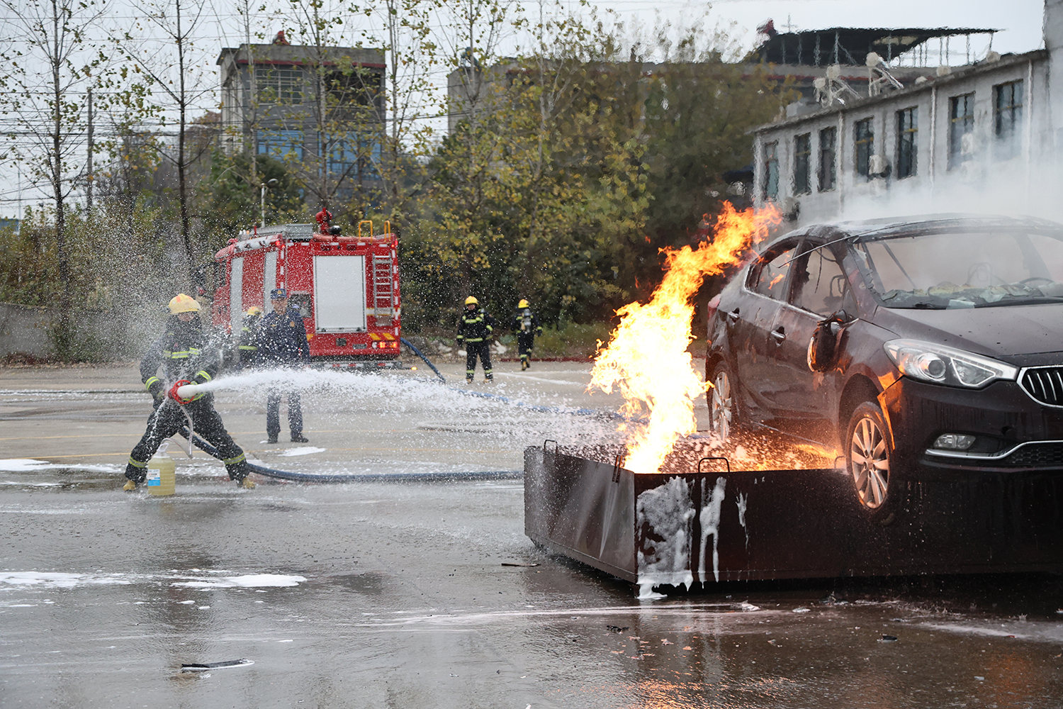 新能源车辆火灾模拟处置区域,消防员精准把握这类火灾处置难点,快速铺设水带、科学实施冷却,凭借娴熟的操作技能和精准的处置策略,高效完成灭火作业,用规范的动作与快速的响应,展现出过硬的应急救援本领。