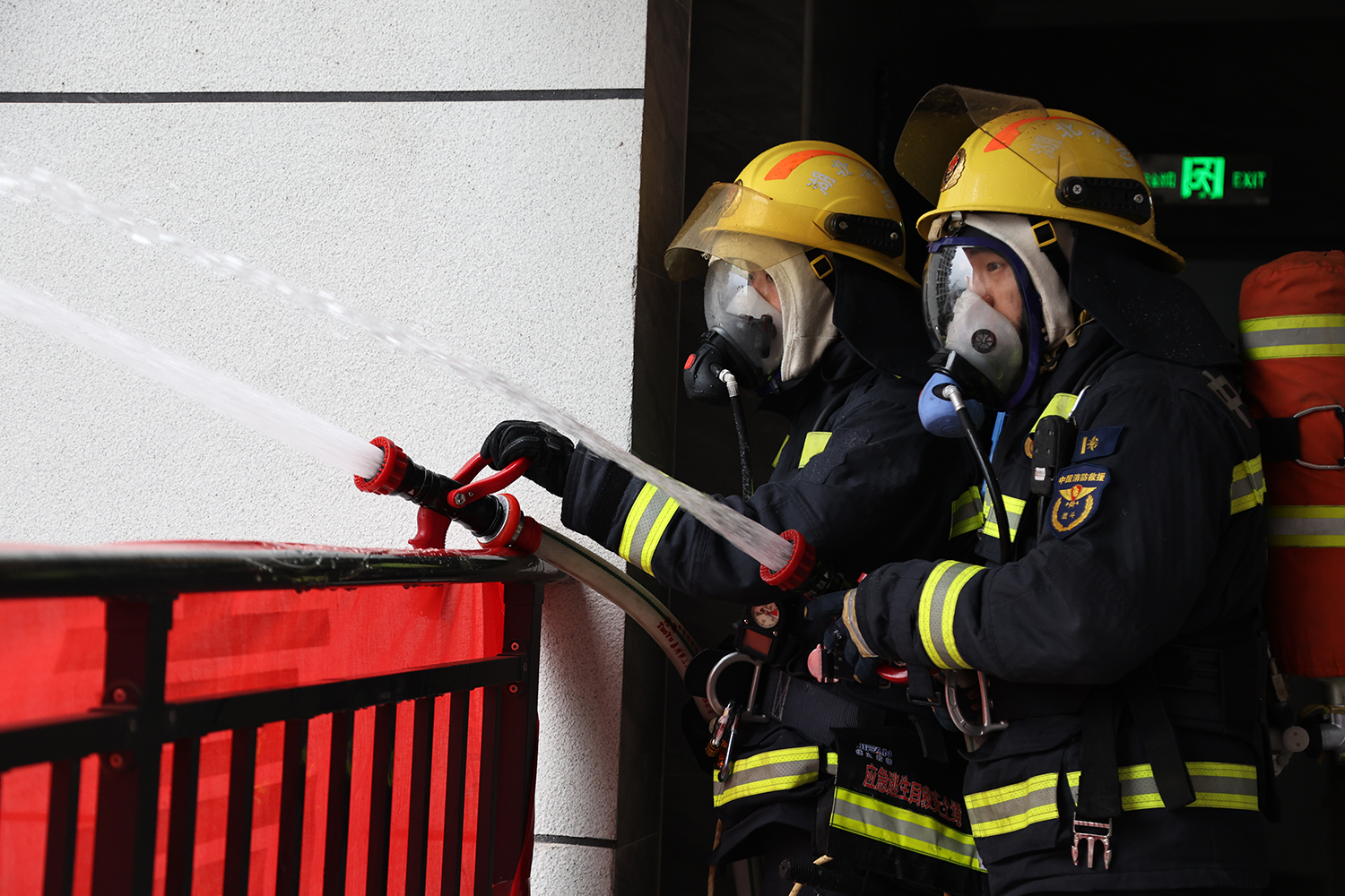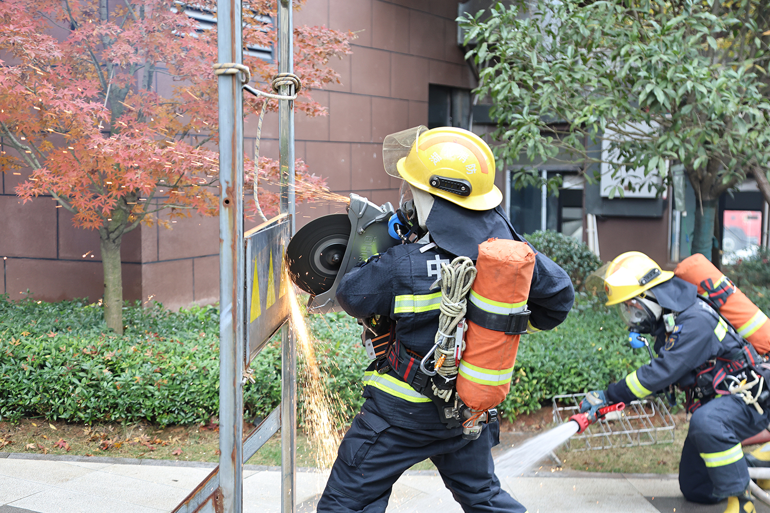 高层建筑火灾模拟处置现场,消防救援人员闻令而动,迅速抵达“火场”,熟练连接水带、精准架设水枪,稳稳压制“火势”;模拟救援热射病患者环节,队员们分工明确、协同联动,破拆、搜救、转移一气呵成,仅数分钟便开辟出生命通道;面对阻碍救援的防盗网,消防队员手持破拆工具精准发力,金属切割声中快速破障,尽显实战硬功。