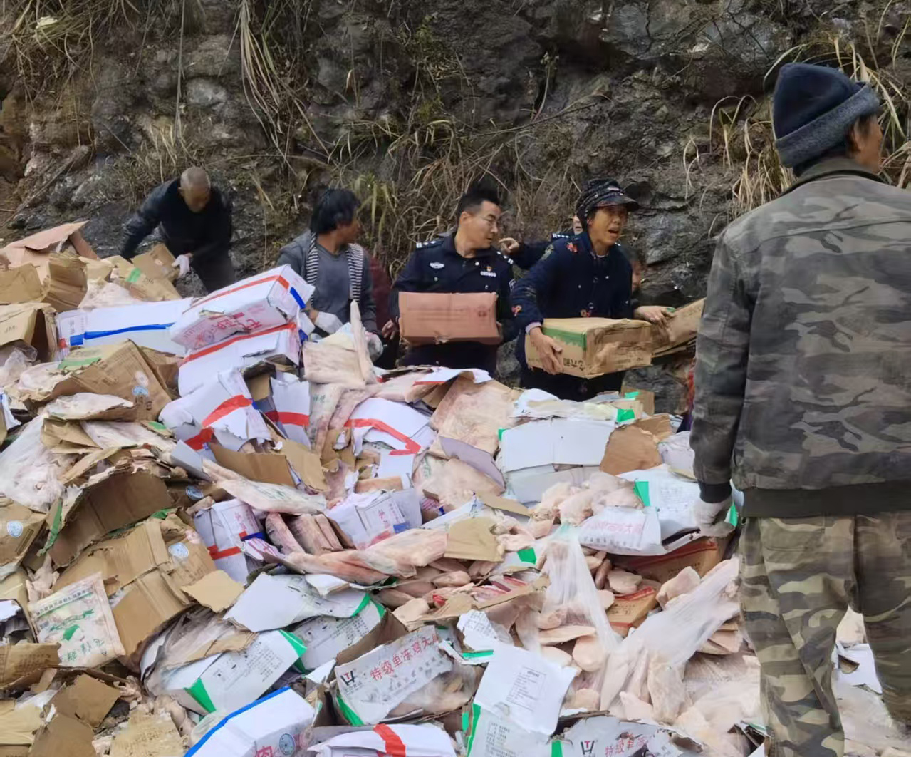 事故现场,民辅警与村民们分工协作,有的搬运货物,有的清点数量,有的指挥车辆转运。经过7个多小时的紧张忙碌,散落的冷冻物品被全部搬运至转运车辆上,事故路段也恢复了正常通行。