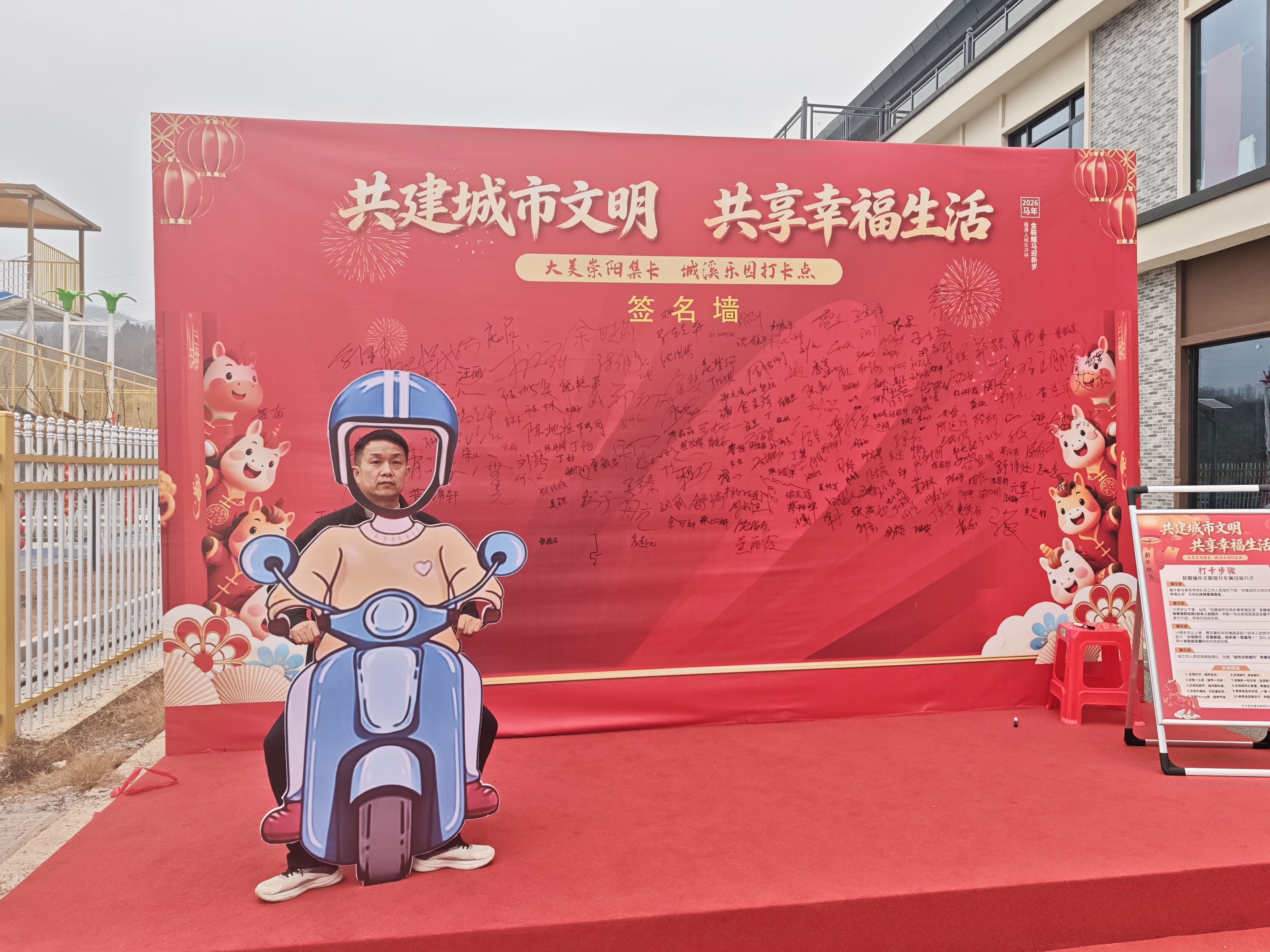 在位于城溪乐园的城市文明提升打卡点,全家老少齐上阵,在签名墙前的摩托车立牌前拍照打卡,合影留念。大家纷纷在“共建城市文明 共享幸福生活”背景墙上签上自己的名字,表示出行要严格遵守交通规则,骑行电动车时自觉佩戴头盔、不非法加装雨篷,做到文明驾驶,安全出行。