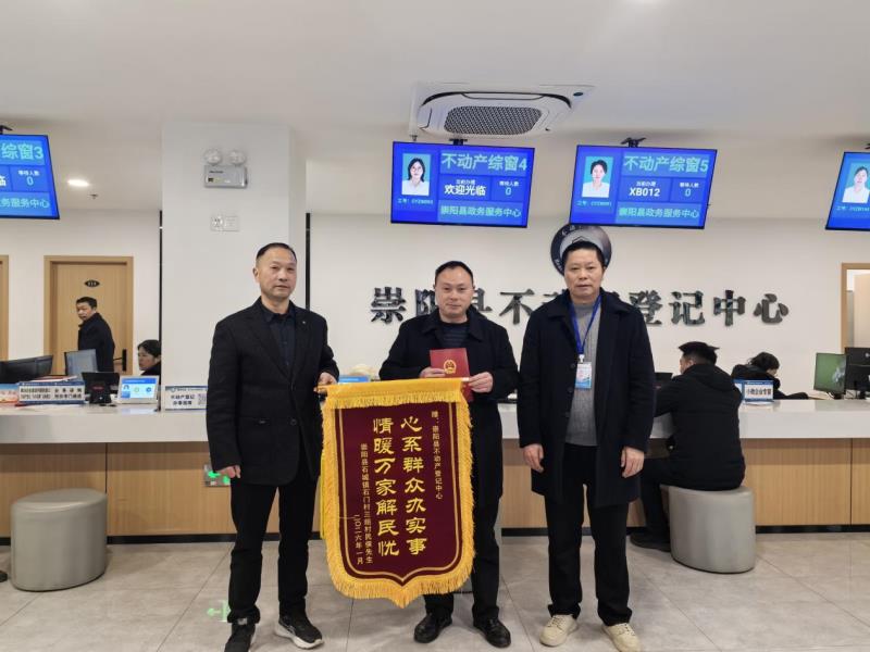 1月30日,侯先生将一面印有“心系群众办实事,情暖万家解民忧”的锦旗,送到崇阳县不动产登记中心,感谢他们以贴心服务帮助自己化解了多年的宅基地办证难题。