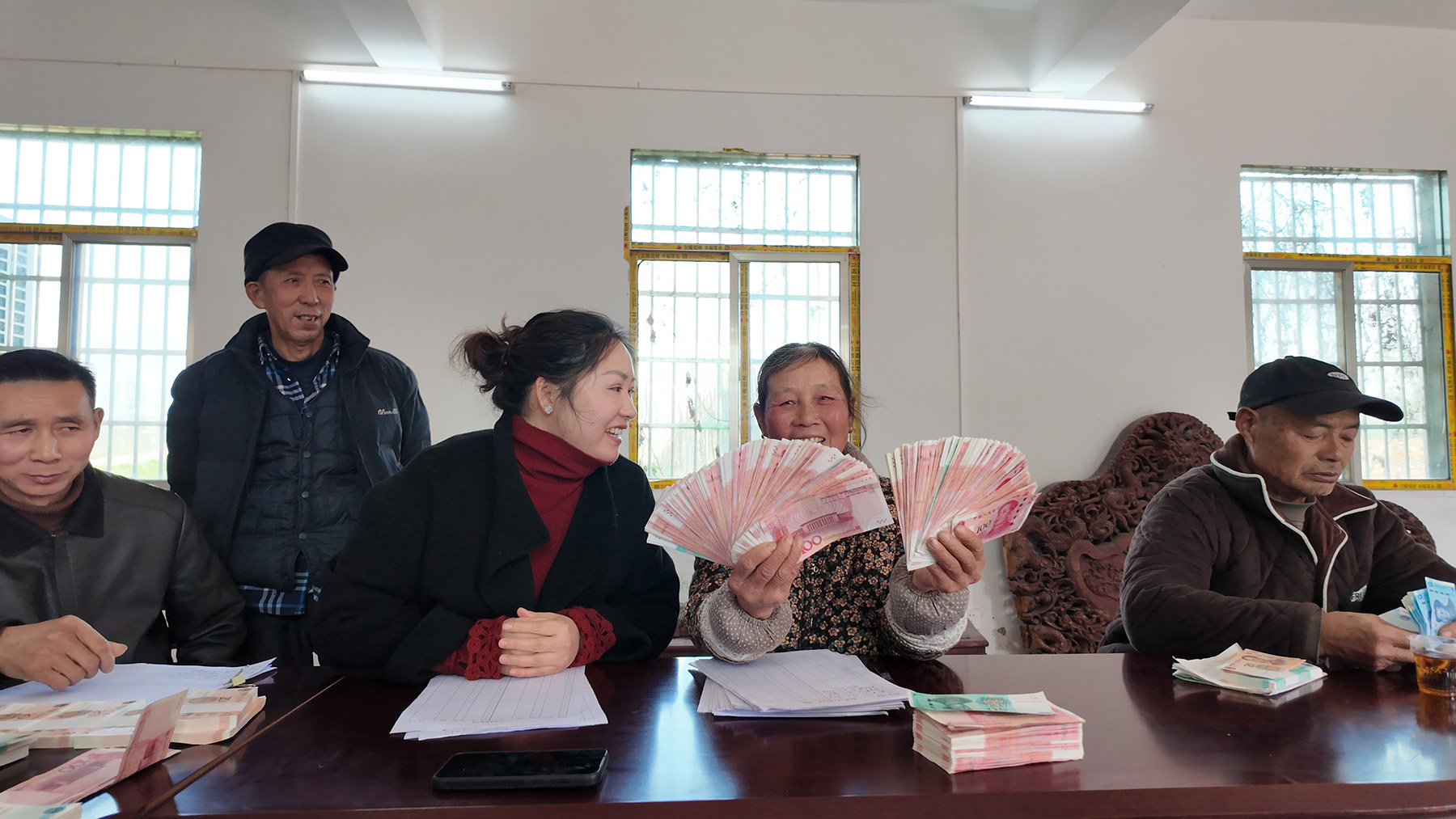 2月11日,湖北黄精哥生态农业有限公司厂房内洋溢着喜庆热闹的气氛,这里正在举行杨洪村药材基地土地租金与工人工资发放仪式,一沓沓现金以最直接、最踏实的方式,将产业发展的红利送到乡亲们手中。