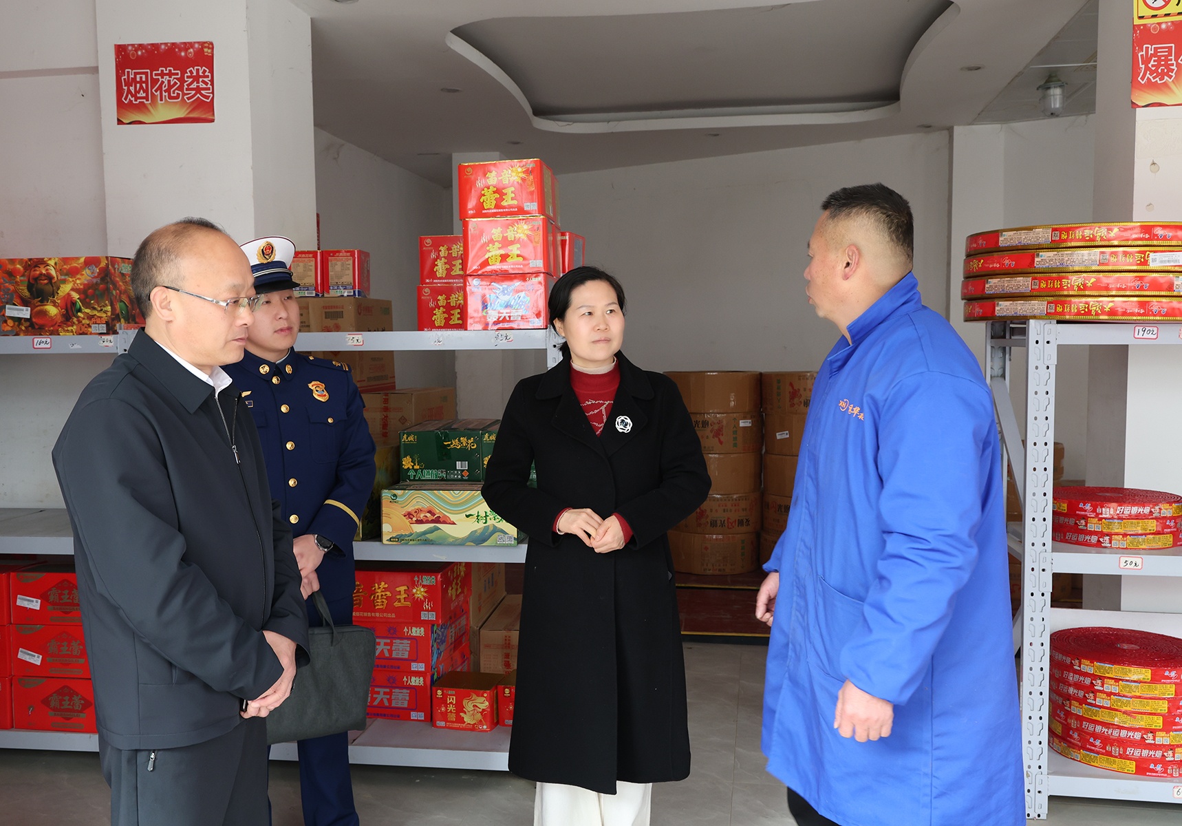 在肖岭乡烟花爆竹批发零售网点,王顺荣详细了解宣传引导、巡查管控等工作开展情况。她指出,当前正值春节假期与春季防火关键期叠加的特殊阶段,随着企业陆续复工复产、元宵佳节临近,烟花爆竹即将进入销售燃放高峰期,必须坚持源头严防、过程严管、风险严控。各级各有关部门要全链条压实企业主体责任和部门监管责任,全流程规范烟花爆竹经营、储存、运输、燃放各环节管理,完善交通疏导和应急救援预案,做到防患于未然。要严格落实“12345”专项管控机制,坚持群防群治,全方位开展政策解读和安全宣传,提升群众知晓率和参与度,推动形成绿色过节、文明过节的良好风尚。要健全完善值班值守和应急响应机制,守牢安全底线、擦亮生态底色,确保全县人民度过一个平安祥和、清新洁净的新春佳节。