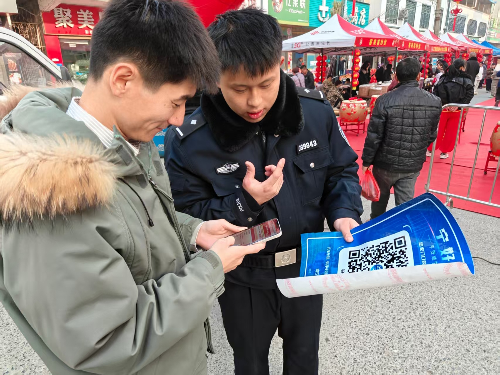 “先生,您扫这个‘宁好码’,登记后出行求助都方便。” 在活动现场,执勤警力不仅维护着舞台与摊位周边秩序,更化身“安全向导”。民警们穿梭于人群中,一边提醒群众注意安全,看护好老人小孩,一边手把手帮助游客注册便民程序,将安全服务送到群众身边。