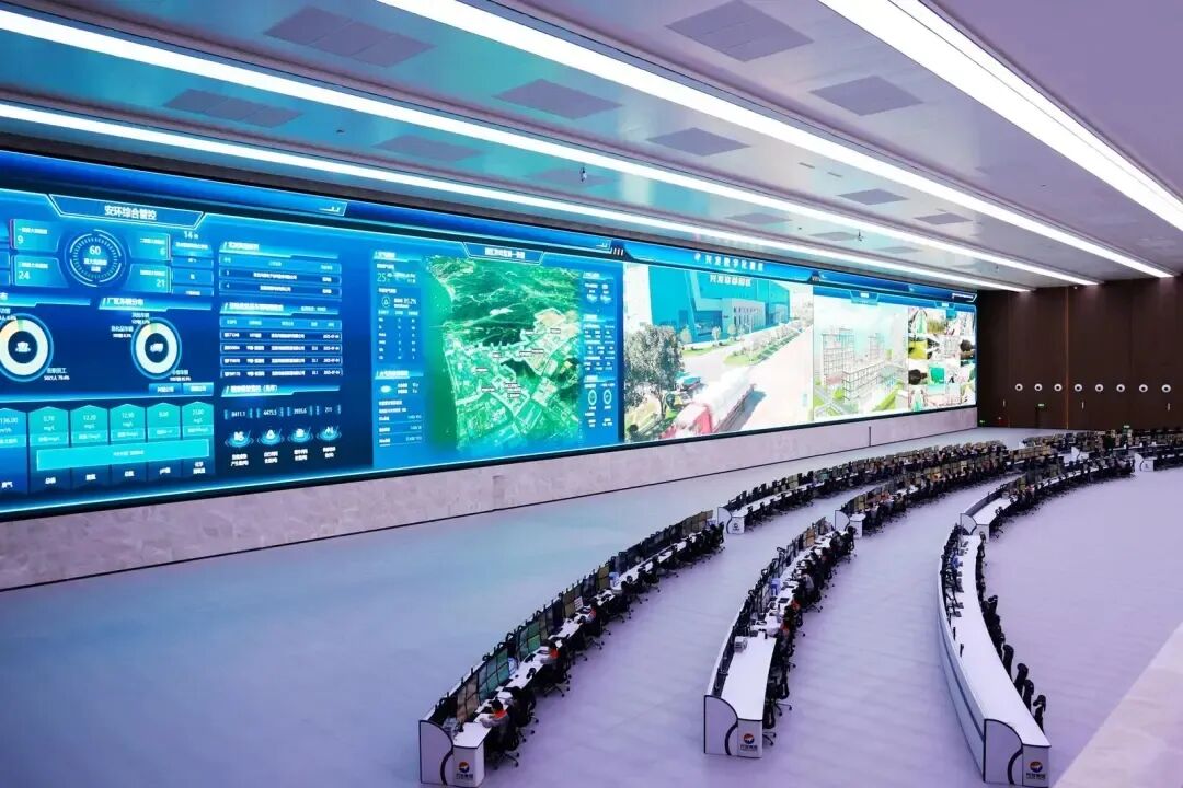 ▲兴发集团智慧管理中心显示屏上,各个园区的生产数据等情况一目了然,工作人员在室内就能实现生产管控。黄翔 摄