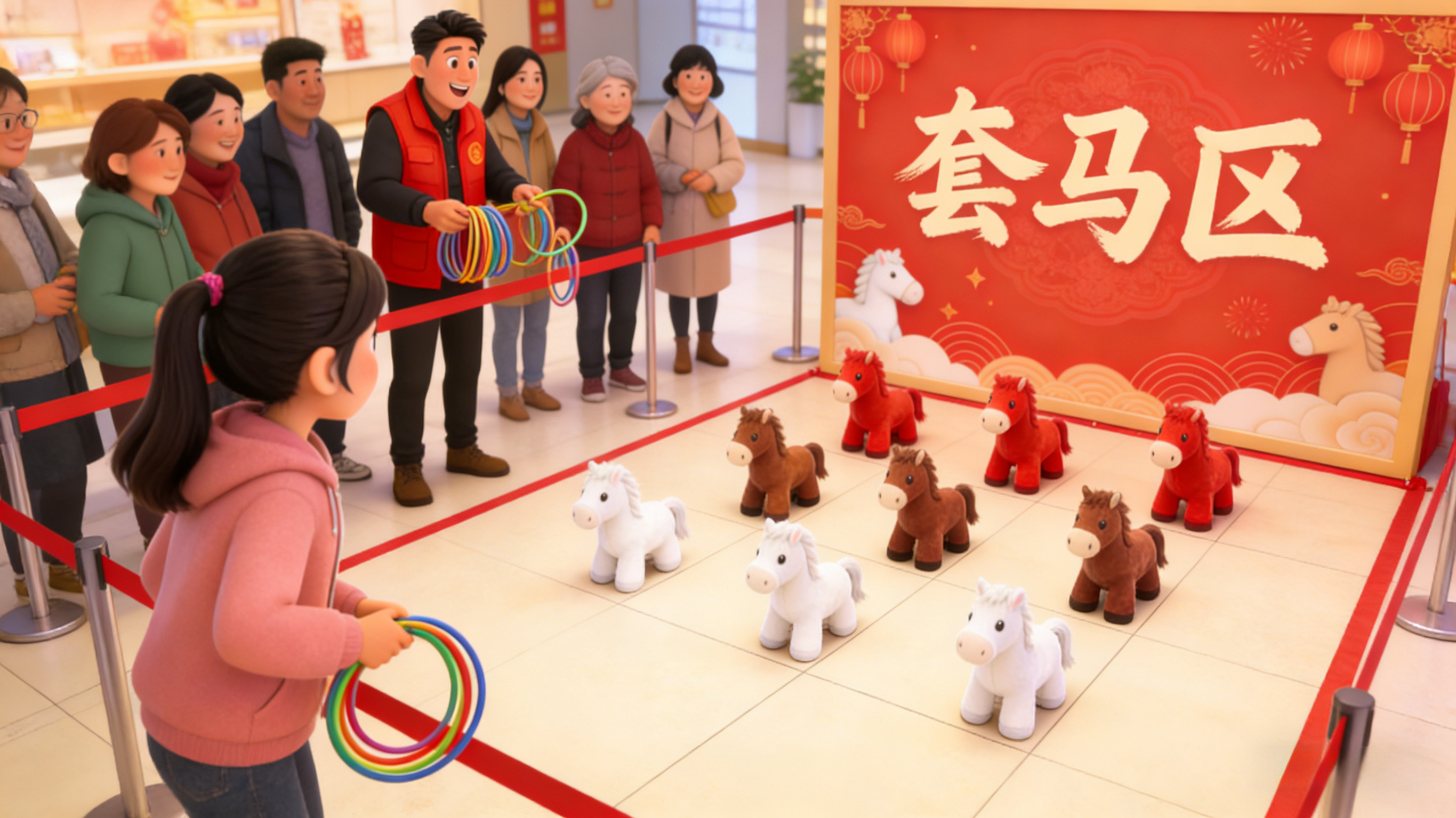 规则:排队参与,站在指定线外投掷。不同造型的“马”代表不同礼物,套中即得!