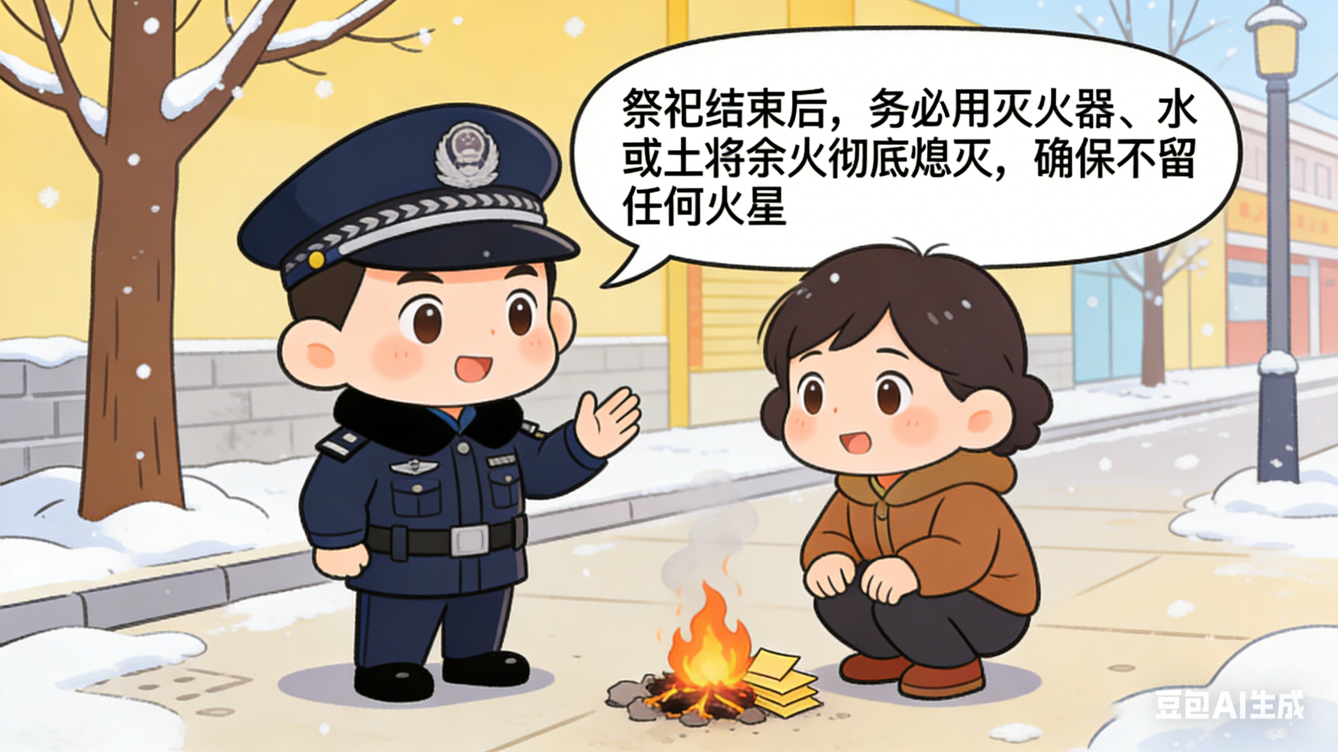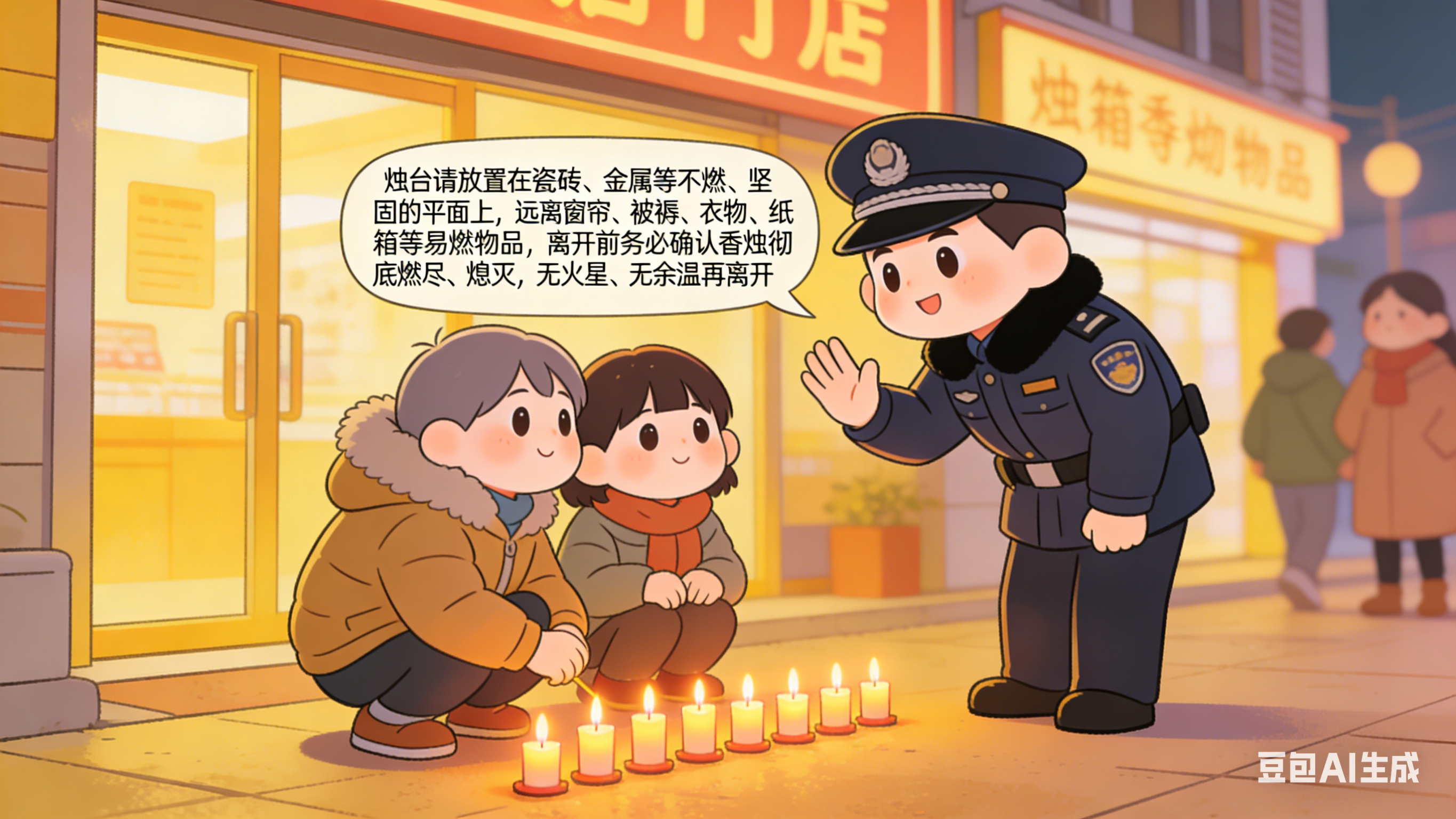 四、规范祈福用火,落实看护措施。倡导广大居民朋友使用电子蜡烛替代明火蜡烛进行祈福,既节能环保又能有效消除火灾隐患。确需在门口进行点烛祈福活动时,请将烛台放置在瓷砖、金属等不燃、坚固的平面上,远离窗帘、被褥、衣物、纸箱等易燃物品。期间务必做到人不离火、火不灭人不离,不要中途离开、做家务或睡觉。离开前务必确认香烛彻底燃尽、熄灭,无火星、无余温再离开。