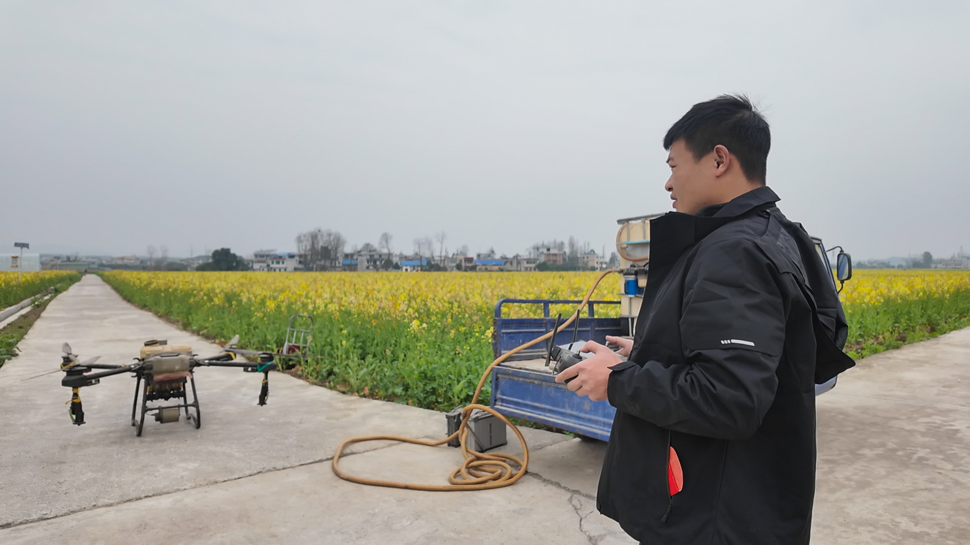 3月4日,在青山镇铺前村七彩油菜花田,淡黄、橙红、粉白、紫色等多彩花株已迎风绽放,层层叠叠、错落有致,勾勒出春日田园的斑斓画卷。在空中,植保无人机缓缓升空,按照预设航线来回穿梭喷洒药剂,地面上,油菜种植户熟练操控遥控器,不时调整飞行高度与速度,确保管护精准高效。