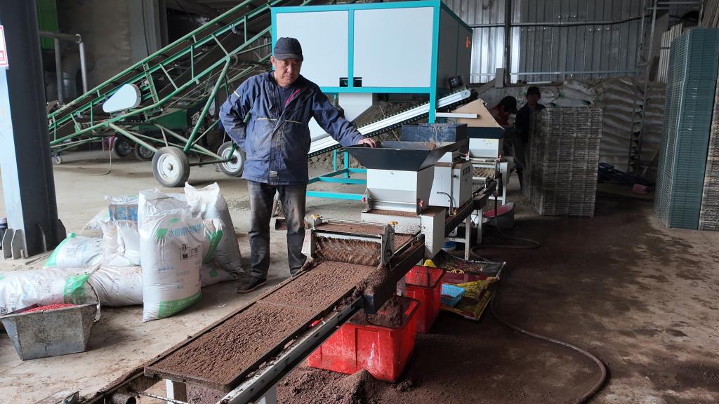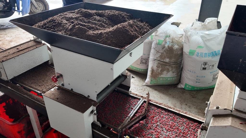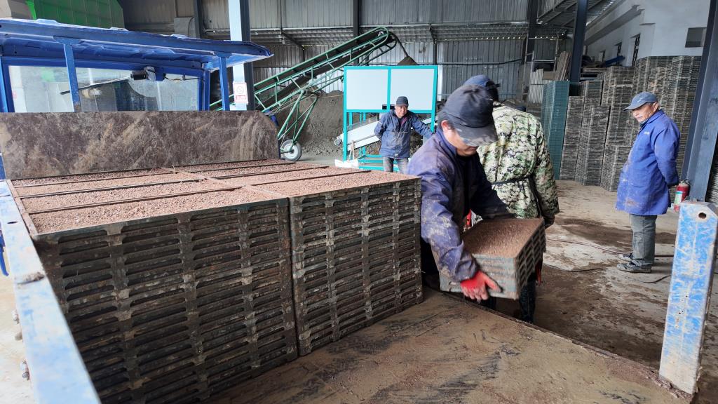 育秧作业现场,稻种经过消毒处理后,送入机械化育秧生产线,一次性完成铺土、播种、覆土等工序,成型秧盘随即转运至大棚进行集中育秧,形成“种子处理—机械播种—大棚育苗”闭环生产链。完成播种的育秧盘将及时转运至大棚进行集中育秧,形成从种子处理、机械播种到大棚育苗的完整生产链条。据现场测算,单台育秧机械单日可完成约6000块秧盘制作,效率较传统人工育秧大幅提升。