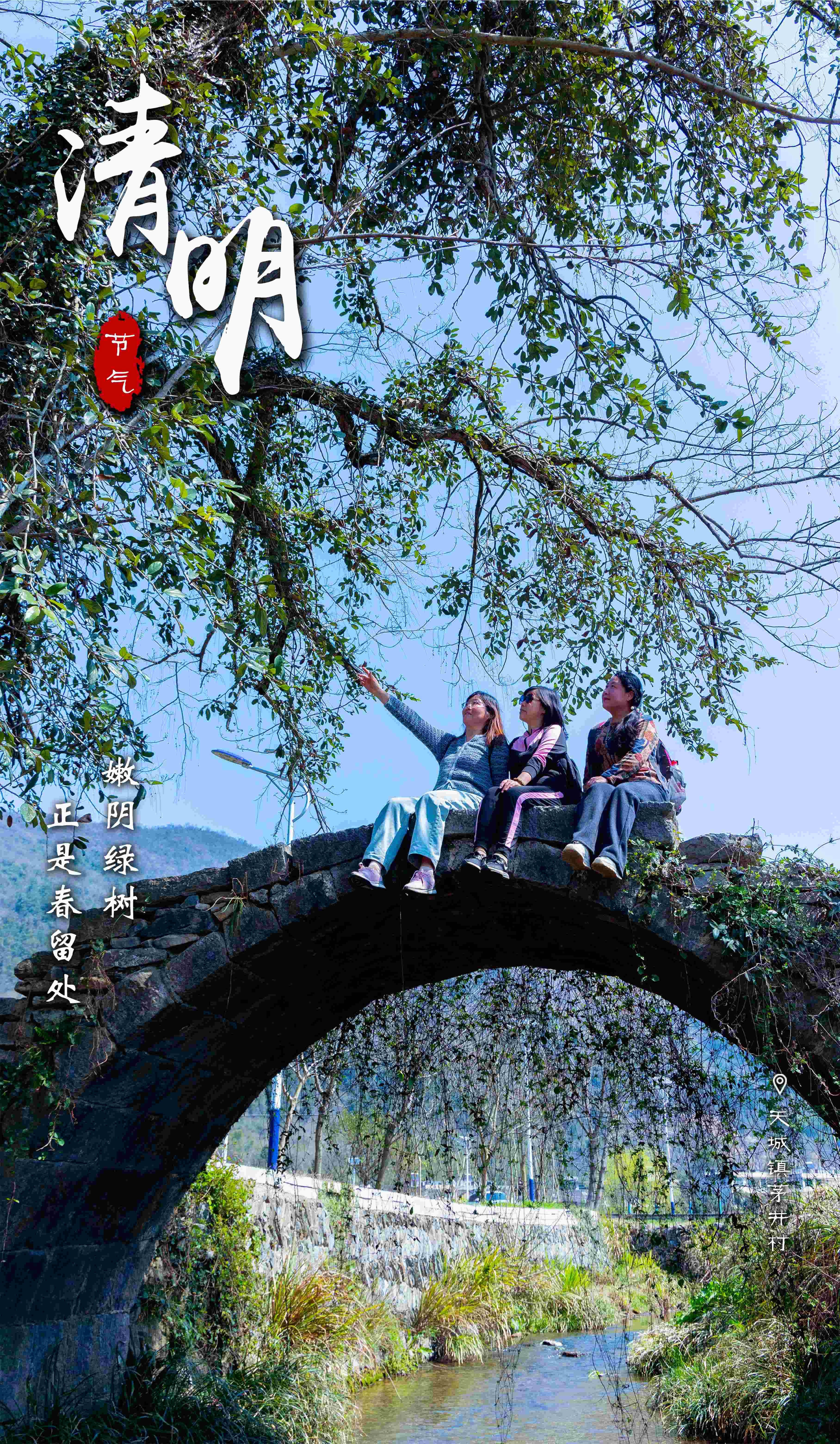 古桥旁,游人静立树下,