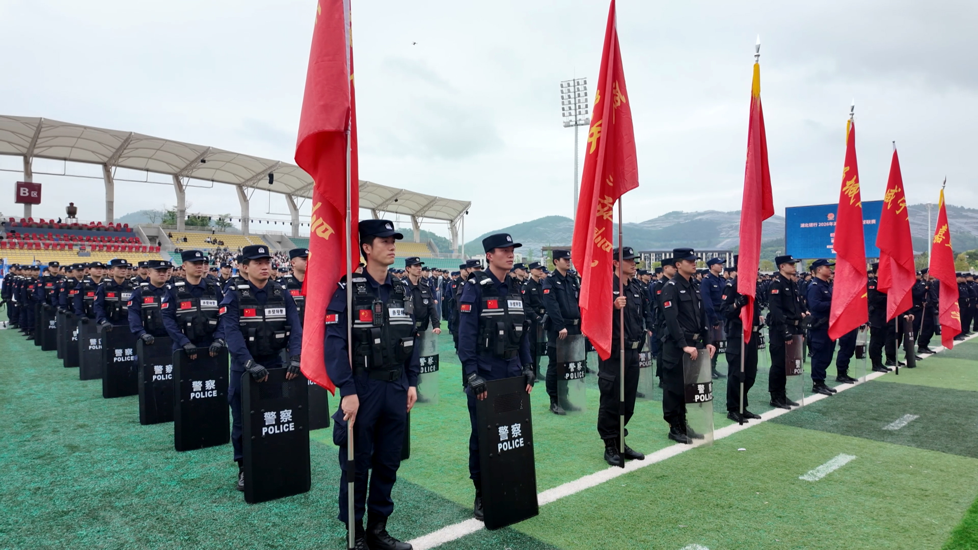 现场演练结束后,1500余名警力在崇阳县文体中心体育场集结,召开了安保工作点评暨誓师动员大会。