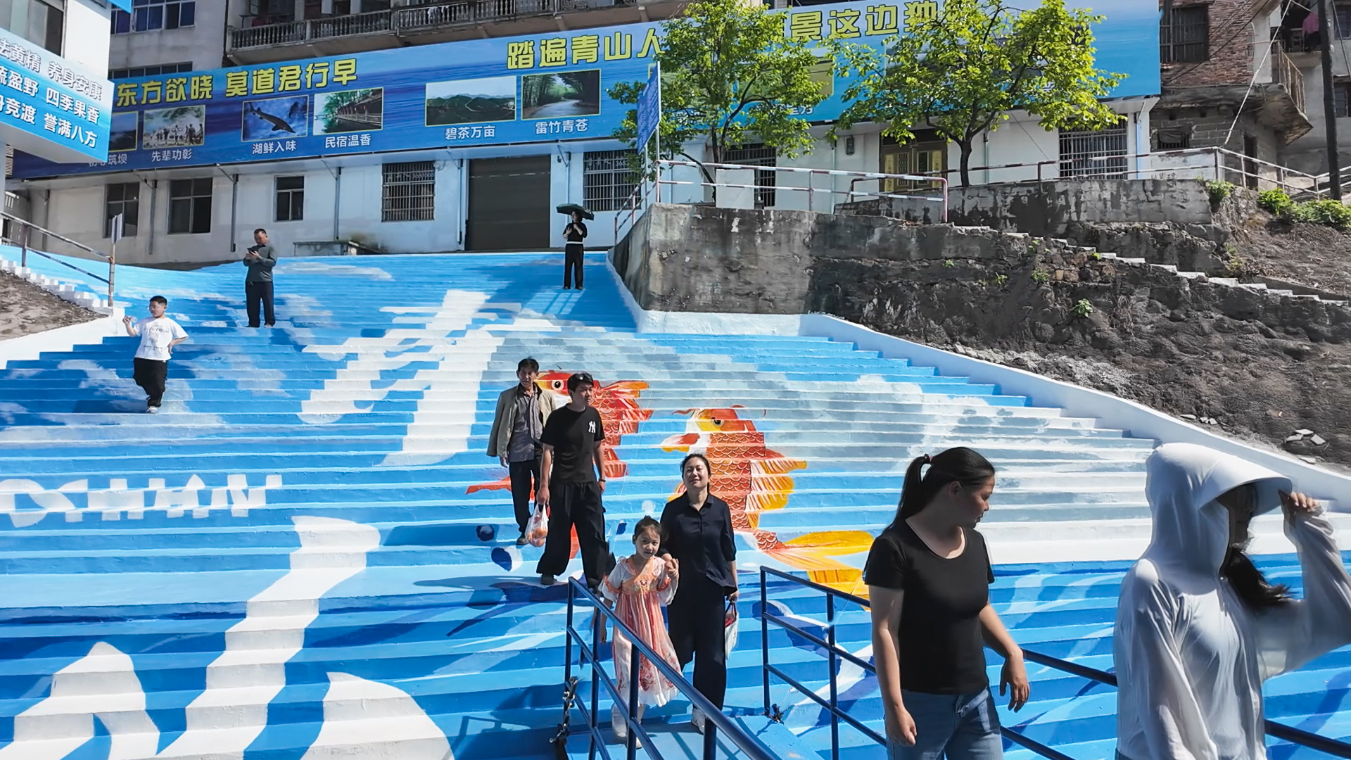4月26日,在崇阳县青山镇东坝码头,一处新增的特色彩绘景观格外吸睛,蓝色主调的台阶上,“青山”二字以渐变效果层层铺展,巧妙融合青山水库的碧波倩影与镇名文化底蕴,引得过往市民、游客纷纷驻足观赏、拍照打卡。