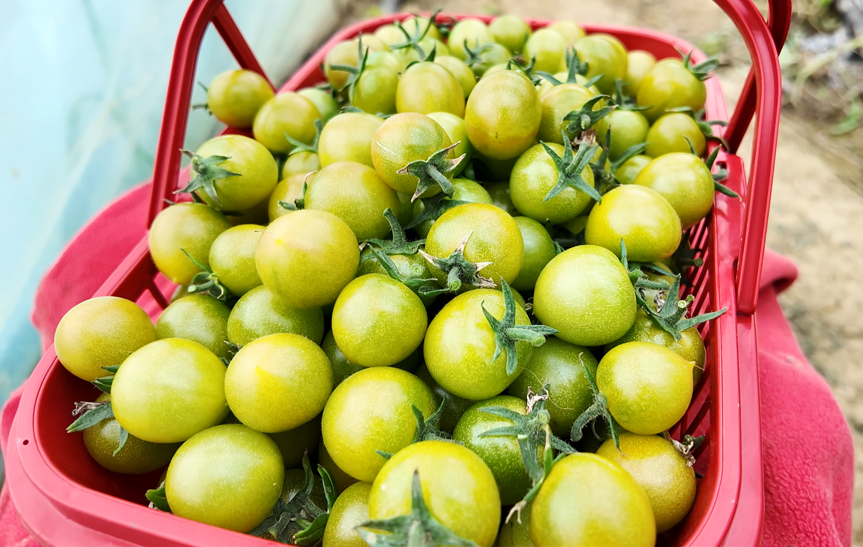 另一侧的大棚里,妻子李卫芳正带着工人们穿梭在垄间,采摘成熟的小番茄,将色泽鲜亮、果体饱满的优质鲜果整齐装入筐中。该采摘园目前培育了6种番茄,涵盖青、红、粉等多种色泽,今年是首次挂果,预计总产量可达1万斤左右。