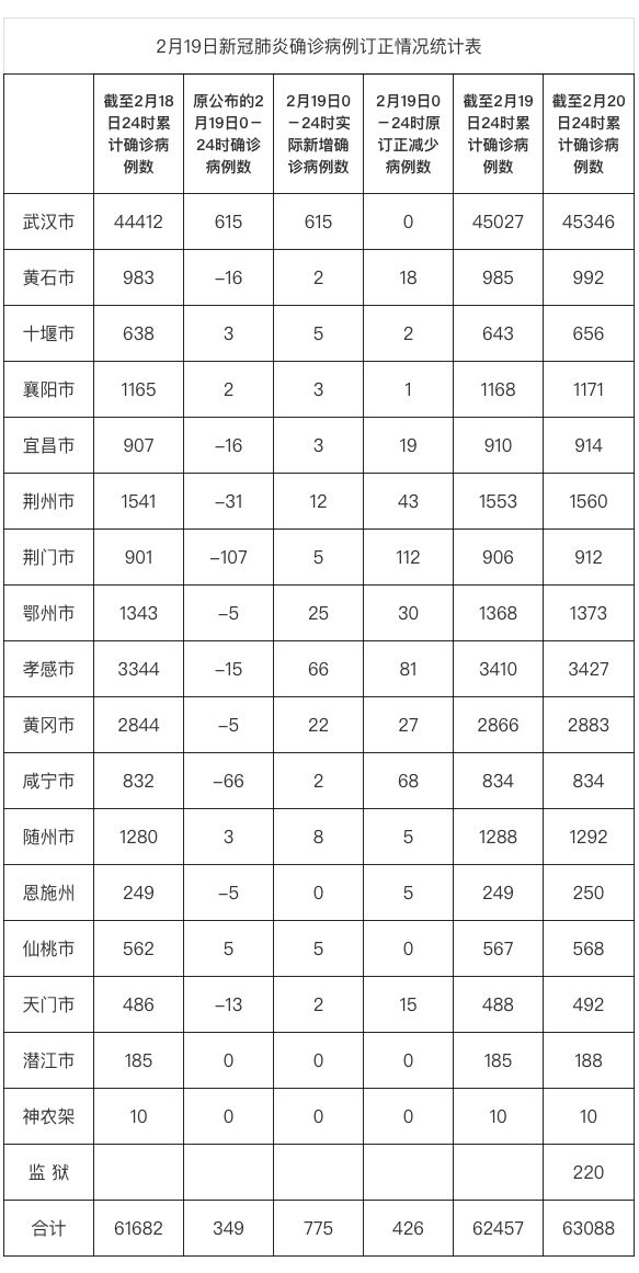 2月19日,有的市州对前期报告的临床诊断病例按照第六版诊疗方案进行订正,核减了部分确诊病例。2月20日发现并及时叫停了这一错误做法。现将2月19日核减的病例数重新加回到确诊病例,并对当日新增病例数进行订正。2月19日0-24时,全省新增确诊病例由349例订正为775例,累计确诊病例数由62031例订正为62457例。同时,将截至2月20日24时的全省累计确诊病例数由62662例订正为63088例。