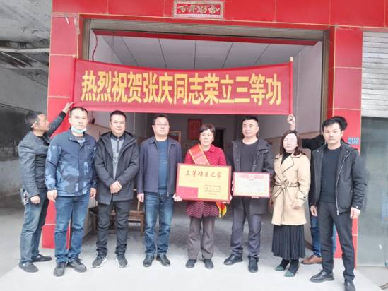 图为慰问组为三等功臣甘红亮及其父母送立功喜报