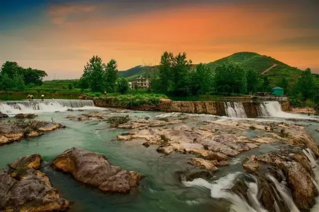 两岸桃花朵朵开,一湾活水入画来。这就是古堰湾!水从古堰流下,幻成白色的瀑布,轰鸣有声,激越如歌。来看古堰的红男绿女,在岸边在堰头在河场,生动着古堰湾的整幅画面。堰上的河水绿如翡翠,静如处子。