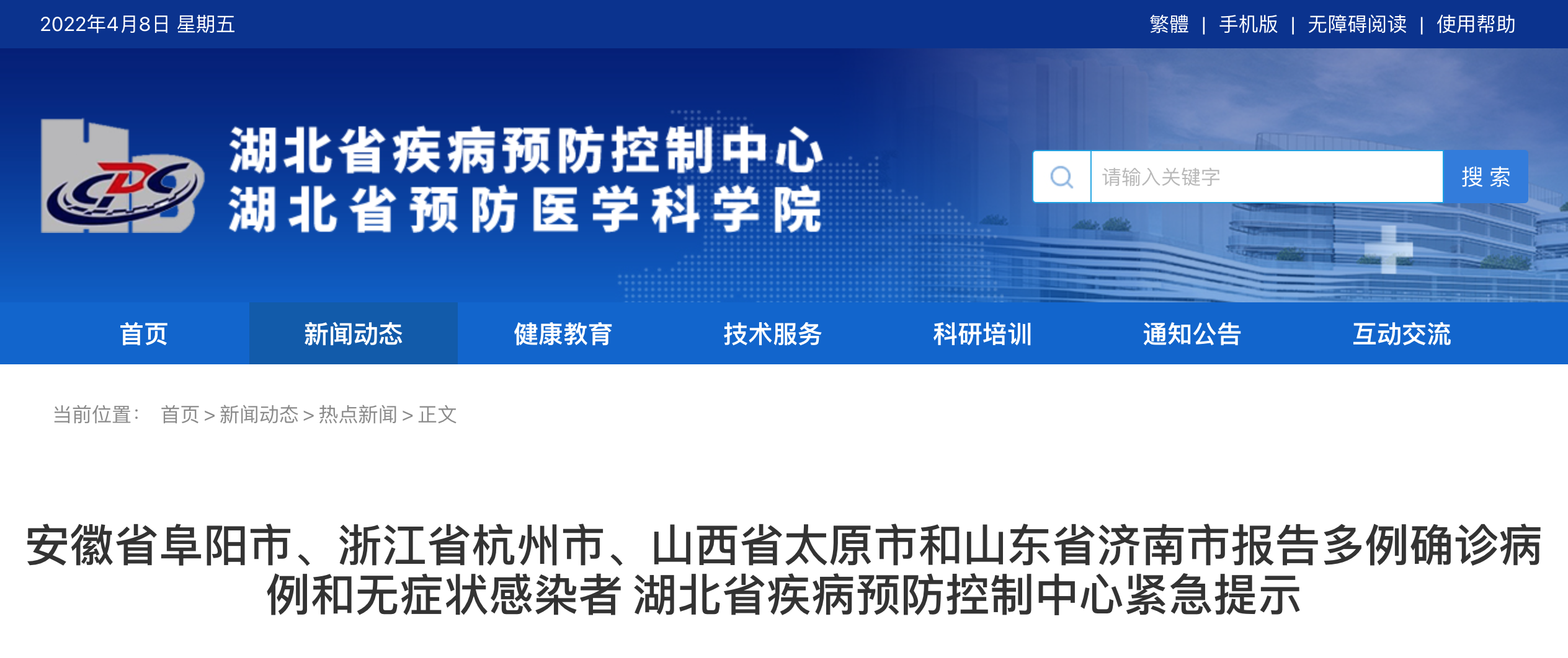 安徽省阜阳市、浙江省杭州市、山西省太原市和山东省济南市报告多例确诊病例和无症状感染者 湖北省疾病预防控制中心紧急提示