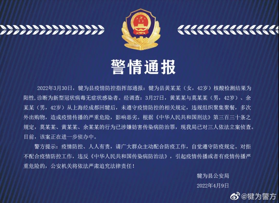 今日(4月9日)凌晨,四川省犍为县警方发布通报:3月30日,犍为县黄某某(女,42岁)核酸检测结果为阳性,诊断为新型冠状病毒无症状感染者。