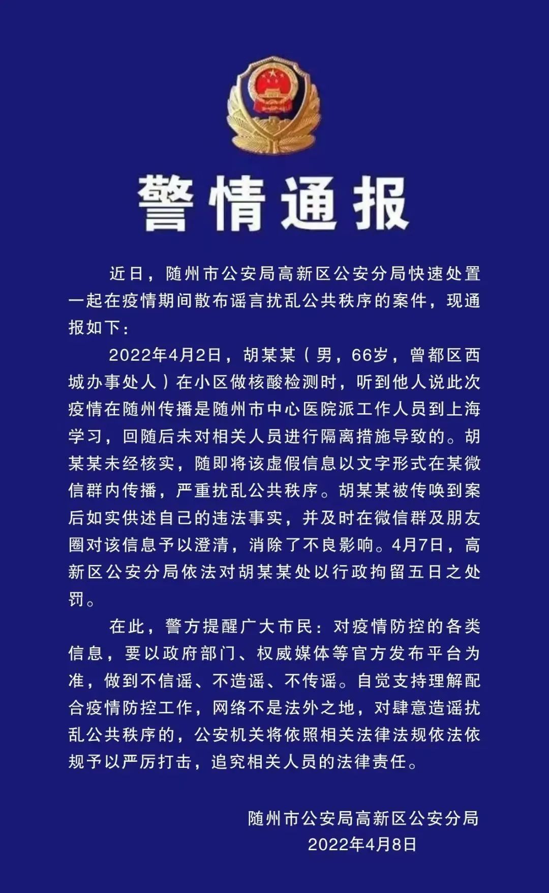据平安随州通报,近日,随州市公安局高新区公安分局快速处置一起在疫情期间散布谣言扰乱公共秩序的案件,现通报如下: