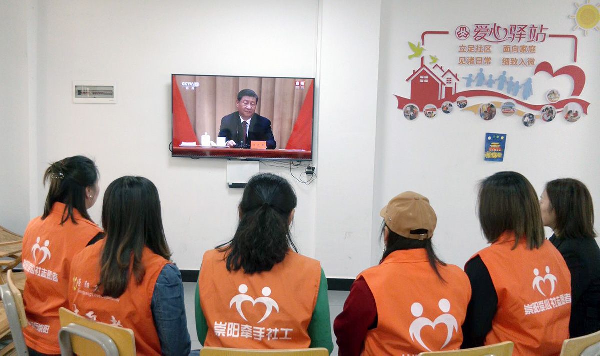 在崇阳县大集社区志愿服务站内,崇阳县牵手社会工作服务中心组织青年社工志愿者集中观看大会直播盛况,习近平总书记对广大共青团员提出殷切希望,希望做理想远大、信念坚定的模范;做刻苦学习、锐意创新的模范;做敢于斗争、善于斗争的模范;做艰苦奋斗、无私奉献的模范;做崇德向善、严守纪律的模范。