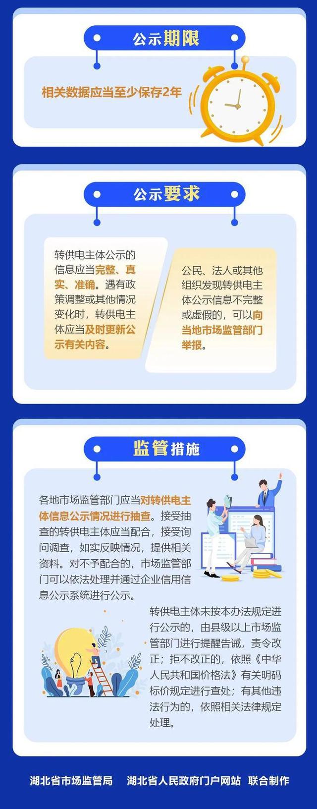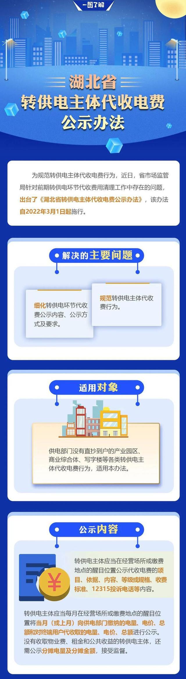 据了解,《湖北省转供电主体代收电费公示办法》于2022年3月1日起施行。《办法》要求,各转供电主体应当在经营场所或缴费地点的醒目位置公示代收电费的项目、依据、内容、等级或规格、收费标准、12315投诉电话等内容。同时,各转供电主体应当每月在经营场所或缴费地点的醒目位置将当月(或上月)向供电部门缴纳的电量、电价、总额和对终端用户代收取的电量、电价、总额进行公示,公示的相关数据应当至少保存2年。公民、法人或其他组织发现转供电主体公示信息不完整或虚假的,可以向当地市场监管部门举报。