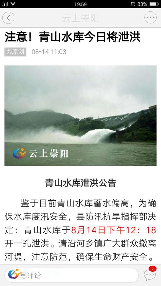 鉴于青山水库蓄水偏高的实情,确保水库安全度汛,14日上午,县防指发布泄洪公告,决定青山水库于8月14日下午12:18开一孔泄洪。请沿河乡镇广大群众撤离河堤,注意防范,确保生命财产安全。